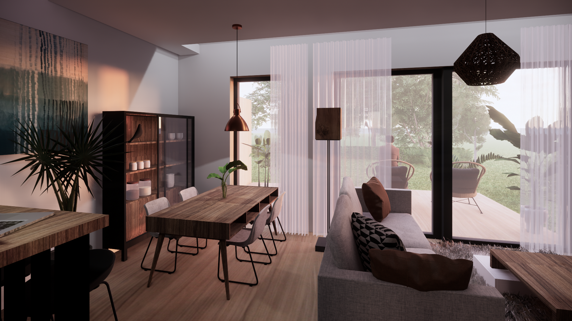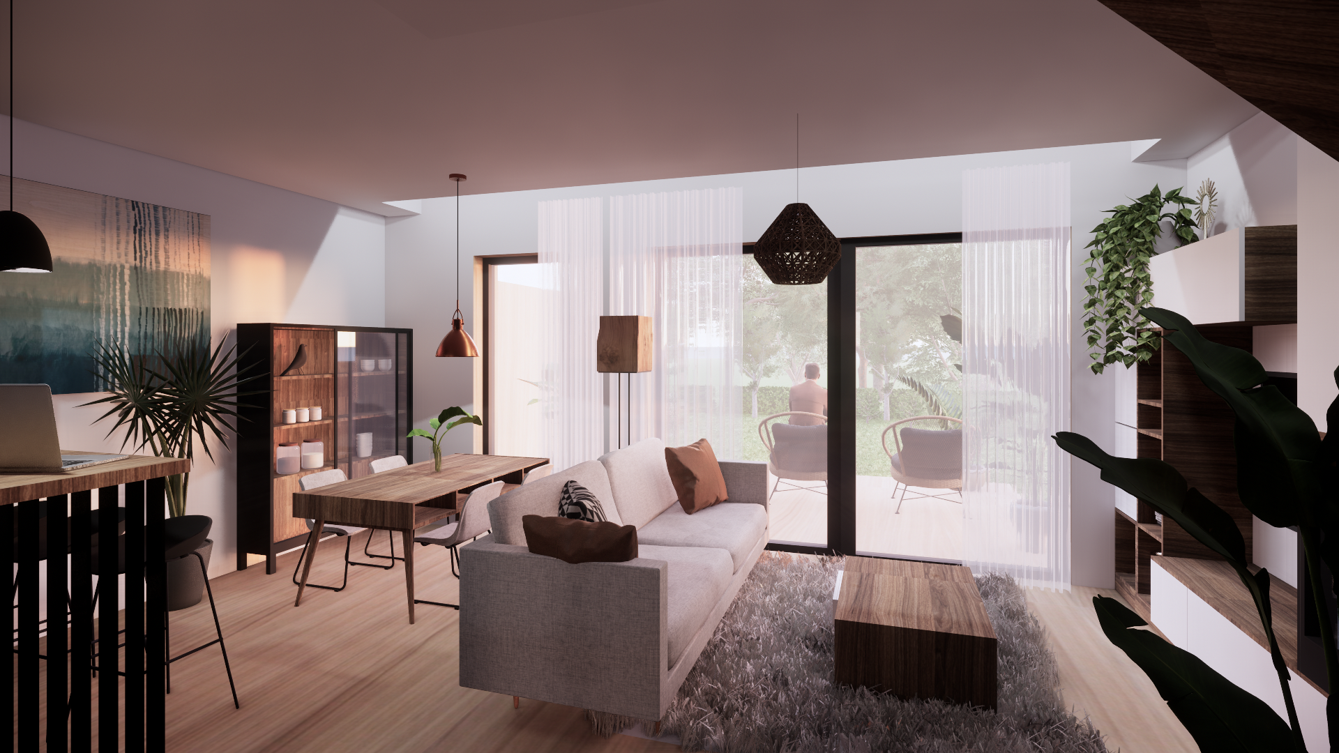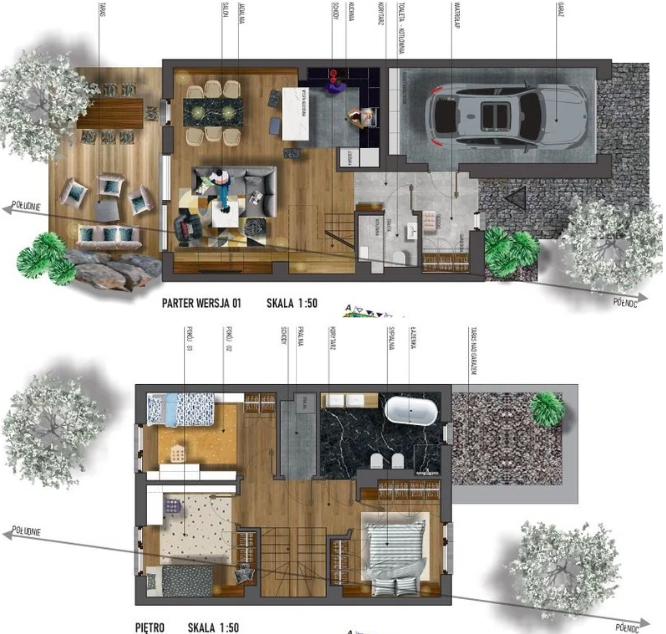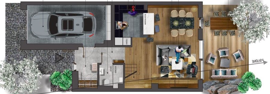 - parter – przestronny salon z kuchnią i jadalnią, łazienka, kominek, ogródek, garaż,