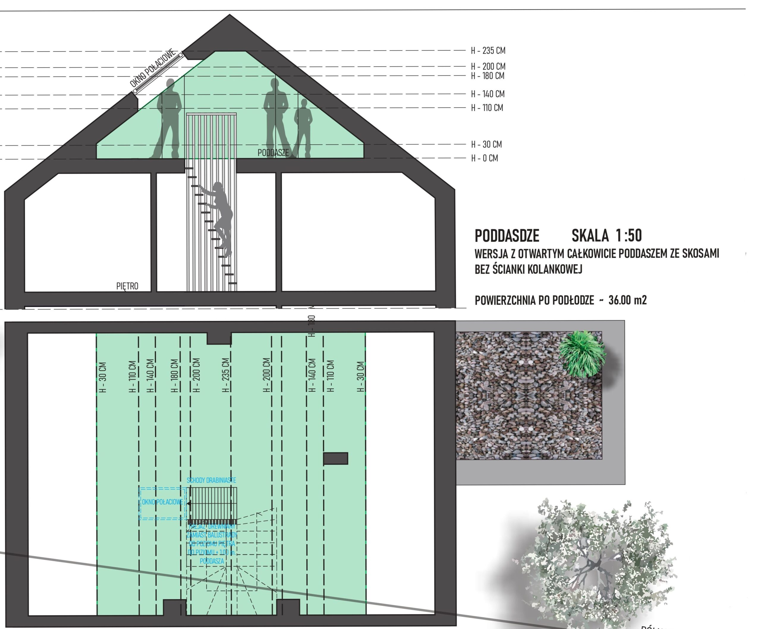 - poddasze – dodatkowa powierzchnia do zagospodarowania ok. 35 m² (np. na pracownię, pokój hobby, sypialnię lub przechowywanie).